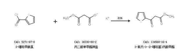 2.通过2-噻吩甲酰氯和丙二酸单甲酯钾盐合成3-氧代-3-(2-噻吩基)丙酸甲酯,收率约83%;