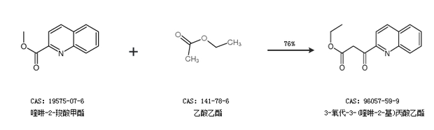 1.通过喹啉-2-羧酸甲酯和乙酸乙酯合成3-氧代-3-(喹啉-2-基)丙酸乙酯,收率约76%;