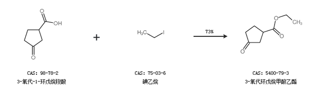 1.通过3-氧代-1-环戊烷羧酸和碘乙烷合成3-氧代环戊烷甲酸乙酯,收率约73%;