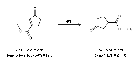 2.通过3-氧代-1-环戊烯-1-羧酸甲酯合成3-氧环戊烷羧酸甲酯,收率约65%;