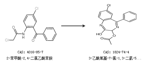 2.通过2-苯甲酰-2,4-二氯乙酰苯胺合成3-乙酰氧基-7-氯-1,3-二氢-5-苯基-2H-1,4-苯并二氮杂革-2-酮