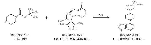 2.通过1-Boc-哌嗪和4-氟-1-[三(1-甲基乙基)硅酯]-1H-吡咯并[2,3-B]吡啶合成4-(1H-吡咯并[2,3-B]吡啶-4-基)-1-哌嗪羧酸叔丁酯,收率约24%;