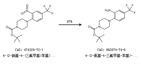 1.通过4-(2-硝基-4-(三氟甲基)苯基)哌嗪-1-羧酸叔丁酯合成4-(2-氨基-4-三氟甲基-苯基)-哌嗪-1-羧酸叔丁酯,收率约97%;