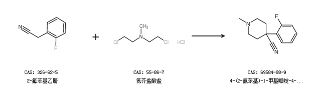 2.通过2-氟苯基乙腈和氮芥盐酸盐合成4-(2-氟苯基)-1-甲基哌啶-4-甲腈