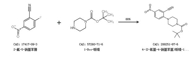 1.通过2-氟-5-硝基苯腈和1-Boc-哌嗪合成4-(2-氰基-4-硝基苯基)哌嗪-1-羧酸叔丁酯,收率约88%;