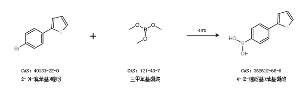 1.通过2-(4-溴苯基)噻吩和三甲氧基硼烷合成4-(2-噻酚基)苯基硼酸,收率约46%;