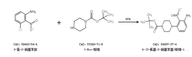 2.通过3-氯-2-硝基苯胺和1-Boc-哌嗪合成4-(3-氨基-2-硝基苯基)哌嗪-1-羧酸叔丁酯,收率约87%;