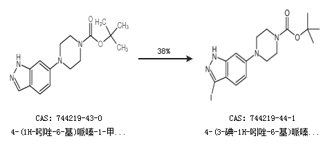 1.通过4-(1H-吲唑-6-基)哌嗪-1-甲酸叔丁酯合成4-(3-碘-1H-吲唑-6-基)哌嗪-1-羧酸叔丁酯,收率约38%;