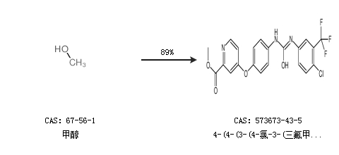 2.通过甲醇合成4-(4-(3-(4-氯-3-(三氟甲基)苯基)脲啶)苯氧基)吡啶甲酸甲酯,收率约89%;