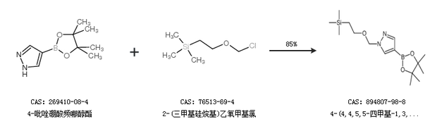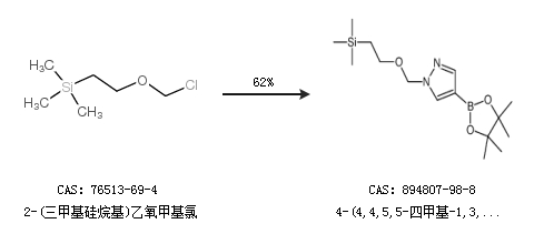 2.通过2-(三甲基硅烷基)乙氧甲基氯合成4-(4,4,5,5-四甲基-1,3,2-二噁硼烷-2-基)-1-([2-(三甲基甲硅烷基)乙氧基]甲基)-1H-吡唑,收率约62%;