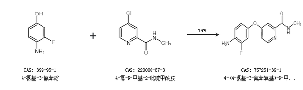 1.通过4-氨基-3-氟苯酚和4-氯-N-甲基-2-吡啶甲酰胺合成4-(4-氨基-3-氟苯氧基)-N-甲基吡啶-2-甲酰胺,收率约74%;
