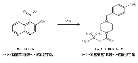 1.通过4-(4-硝基苯)哌嗪-1-羧酸叔丁酯合成4-(4-氨基苄基)哌嗪-1-羧酸叔丁酯,收率约97%;