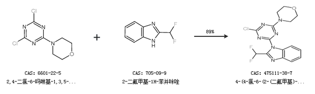 中文别名 4-(4-氯-6-(2-(二氟甲基)-1H-苯并[D]咪唑-1-基)-1,3,5-三嗪-2-基)吗啉;1-[4-氯-6-(4-吗啡啉)-1,3,5-三杂-2-基]-2-(二氟甲基)-1H-苯并咪唑;