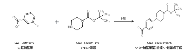 1.通过对氟硝基苯和1-Boc-哌嗪合成4-(4-硝基苯基)哌嗪-1-羧酸叔丁酯,收率约97%;