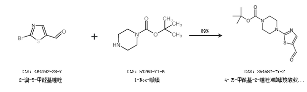 1.通过2-溴-5-甲醛基噻唑和1-Boc-哌嗪合成4-(5-甲酰基-2-噻唑)哌嗪羧酸叔丁酯,收率约89%;