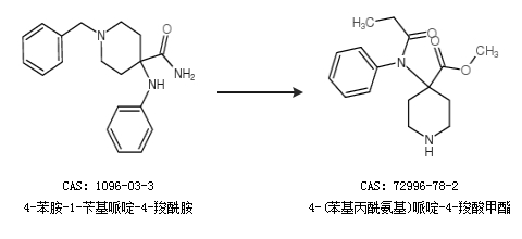 1.通过4-苯胺-1-苄基哌啶-4-羧酰胺合成4-(苯基丙酰氨基)哌啶-4-羧酸甲酯