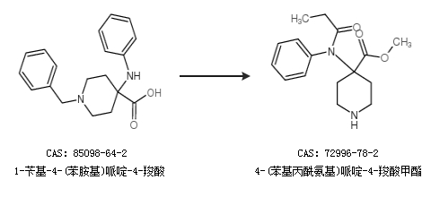 2.通过1-苄基-4-(苯胺基)哌啶-4-羧酸合成4-(苯基丙酰氨基)哌啶-4-羧酸甲酯