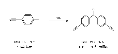 2.通过4-碘氰基苯合成4,4’-二氰基二苯甲酮,收率约88%;
