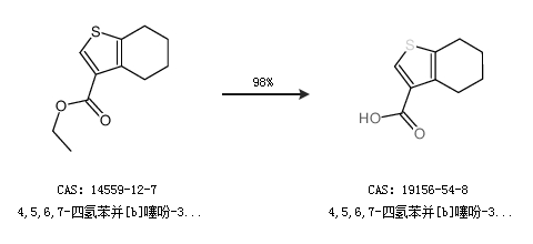1.通过4,5,6,7-四氢苯并[b]噻吩-3-羧酸乙酯合成4,5,6,7-四氢苯并[b]噻吩-3-羧酸,收率约98%;