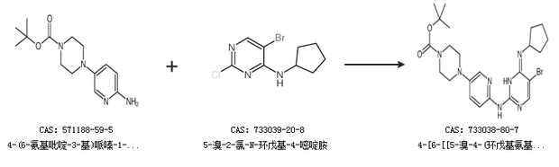 1.通过4-(6-氨基吡啶-3-基)哌嗪-1-羧酸叔丁酯和5-溴-2-氯-N-环戊基-4-嘧啶胺合成4-[6-[[5-溴-4-(环戊基氨基)-2-嘧啶]氨基]-3-吡啶]-1-哌嗪羧酸 1,1-二甲基乙酯