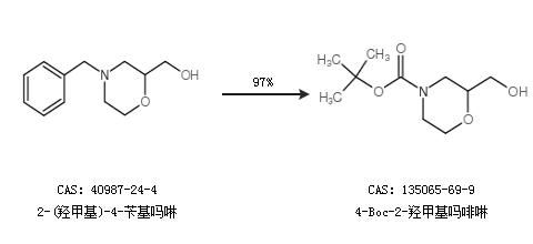 1.通过2-(羟甲基)-4-苄基吗啉合成4-Boc-2-羟甲基吗啡啉,收率约97%;