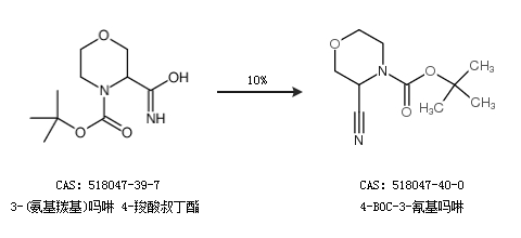 1.通过3-(氨基羰基)吗啉 4-羧酸叔丁酯合成4-BOC-3-氰基吗啉,收率约10%;