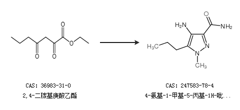 1.通过2,4-二羰基庚酸乙酯合成4-氨基-1-甲基-5-丙基-1H-吡唑-3-羧酸酰胺