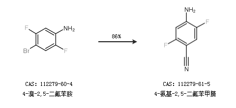 1.通过4-溴-2,5-二氟苯胺合成4-氨基-2,5-二氟苯甲腈,收率约86%;