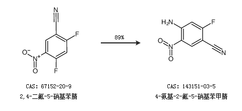 1.通过2,4-二氟-5-硝基苯腈合成4-氨基-2-氟-5-硝基苯甲腈,收率约89%;