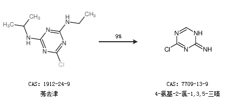 2.通过莠去津合成4-氨基-2-氯-1,3,5-三嗪,收率约9%;