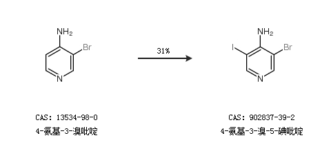 1.通过4-氨基-3-溴吡啶合成4-氨基-3-溴-5-碘吡啶,收率约31%;
