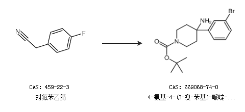 1.通过对氟苯乙腈合成4-氨基-4-(3-溴-苯基)-哌啶-1-羧酸叔丁酯