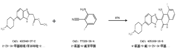 1.通过2-[5-(4-甲基哌嗪)苯并咪唑-2-基]乙酸乙酯和2-氨基-6-氟苯甲腈合成4-氨基-5-氟-3-[5-(4-甲基哌嗪-1-基)-1H-苯并咪唑-2-基]喹啉-2(1H)-酮,收率约87%;
