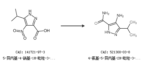 1.通过5-异丙基-4-硝基-1H-吡唑-3-羧酸合成4-氨基-5-异丙基-2H-吡唑-3-甲酰胺