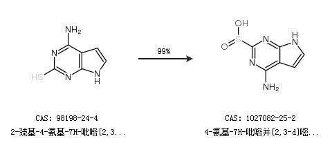 1.通过2-巯基-4-氨基-7H-吡咯[2,3-d]嘧啶合成4-氨基-7H-吡咯并[2,3-d]嘧啶-2-磺酸,收率约99%;