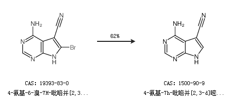 1.通过4-氨基-6-溴-7H-吡咯并[2,3-d]嘧啶-5-甲腈合成4-氨基-7h-吡咯并[2,3-d]嘧啶-5-甲腈,收率约62%;