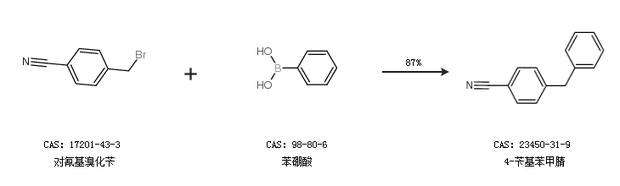 1.通过对氰基溴化苄和苯硼酸合成4-苄基苯甲腈,收率约87%;