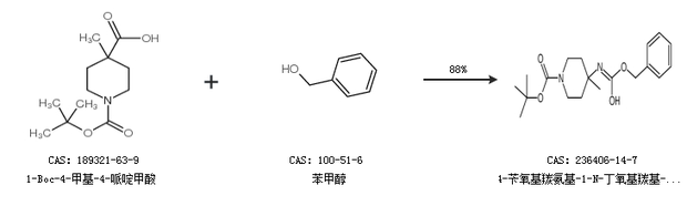 1.通过1-Boc-4-甲基-4-哌啶甲酸和苯甲醇合成4-苄氧基羰氨基-1-N-丁氧基羰基-4-甲基哌啶,收率约88%;