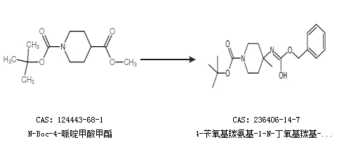 2.通过N-Boc-4-哌啶甲酸甲酯合成4-苄氧基羰氨基-1-N-丁氧基羰基-4-甲基哌啶