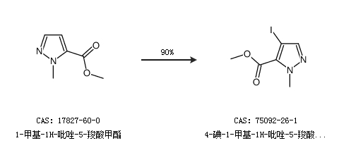 1.通过1-甲基-1H-吡唑-5-羧酸甲酯合成4-碘-1-甲基-1H-吡唑-5-羧酸甲酯,收率约90%;
