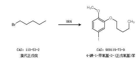 1.通过溴代正戊烷合成4-碘-1-甲氧基-2-(正戊氧基)苯,收率约86%;