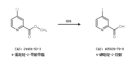 1.通过4-氯吡啶-2-甲酸甲酯合成4-碘吡啶-2-羧酸,收率约88%;
