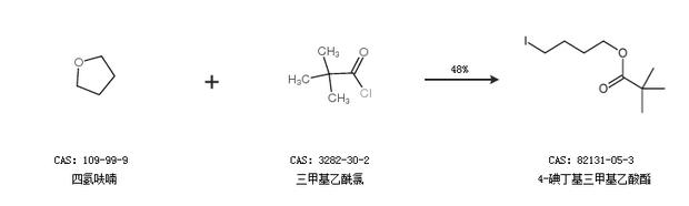 1.通过四氢呋喃和三甲基乙酰氯合成4-碘丁基三甲基乙酸酯,收率约48%;