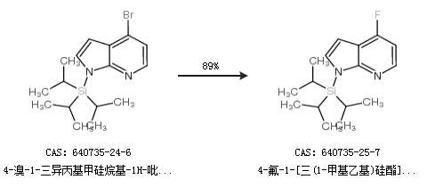 1.通过4-溴-1-三异丙基甲硅烷基-1H-吡咯并[2,3-b]吡啶合成4-氟-1-[三(1-甲基乙基)硅酯]-1H-吡咯并[2,3-B]吡啶,收率约89%;