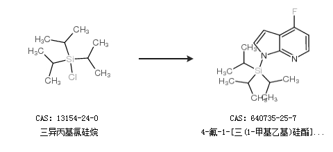 英文别名 PYRROLO[2,3-B]PYRIDINE,4-FLUORO-1-[TRIS(1-METHYLETHYL)SILYL];N-triisopropylsilyl-4-fluoro-7-azaindole;1H-PYRROLO[2,3-B]PYRIDINE,4-FLUORO-1-[TRIS(1-METHYLETHYL)SILYL];4-fluoro-1-(triisopropylsilyl)-1H-pyrrolo[2,3-b]pyridine;4-FLUORO-1-(TRIISOPROPYLSILANYL)-7-AZAINDOLE;4-fluoro-1-triisopropylsilanyl-1H-pyrrolo[2,3-b]pyridine;1-triisopropyl-4-fluoro-7-azaindole;4-fluoro-1-[tris(propan-2-yl)silyl]-1H-pyrrolo[2,3-b]pyridine;4-FLUORO-1-[TRIS(1-METHYLETHYL)SILYL]-1H-PYRROLO[2,3-B]PYRIDINE;