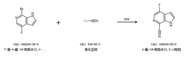 1.通过7-溴-4-氟-1H-吡咯并[2,3-c]吡啶和氰化亚铜合成4-氟-1H-吡咯并[2,3-c]吡啶-7-甲腈,收率约65%;