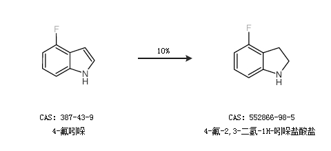 1.通过4-氟吲哚合成4-氟-2,3-二氢-1H-吲哚盐酸盐,收率约10%;