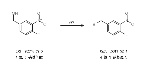 1.通过4-氟-3-硝基苄醇合成4-氟-3-硝基溴苄,收率约97%;