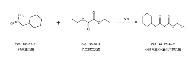 2.通过环己基丙酮和乙二酸二乙酯合成4-环己基-3-氧代丁酸乙酯,收率约55%;