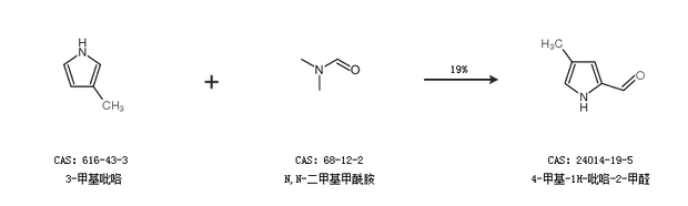 1.通过3-甲基吡咯和N,N-二甲基甲酰胺合成4-甲基-1H-吡咯-2-甲醛,收率约19%;